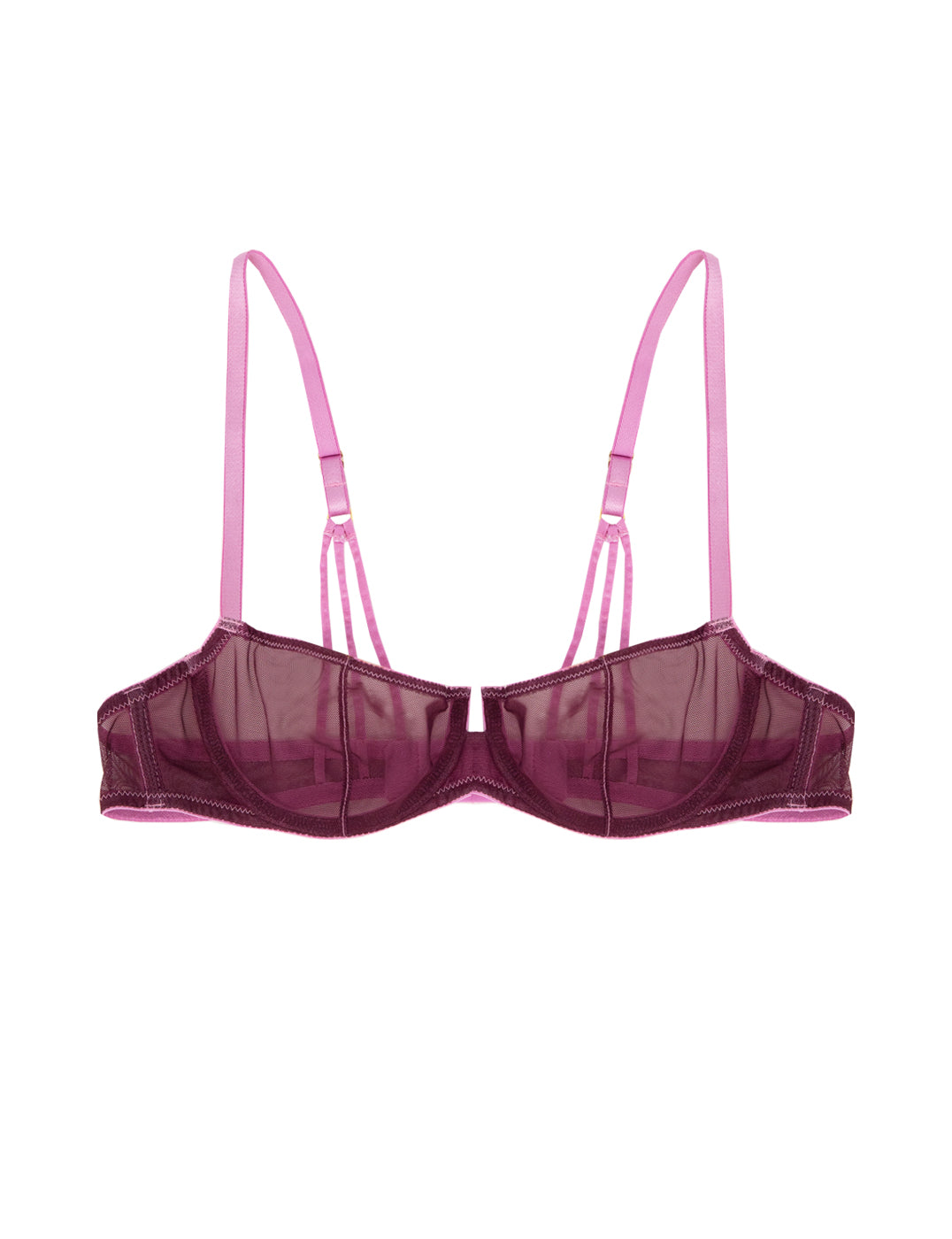 Underwire bra in dark red recycled material, with light pink stitching and details. Closure at the back and with fully adjustable shoulder straps.