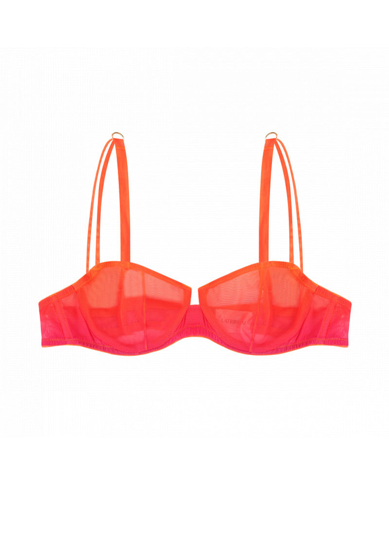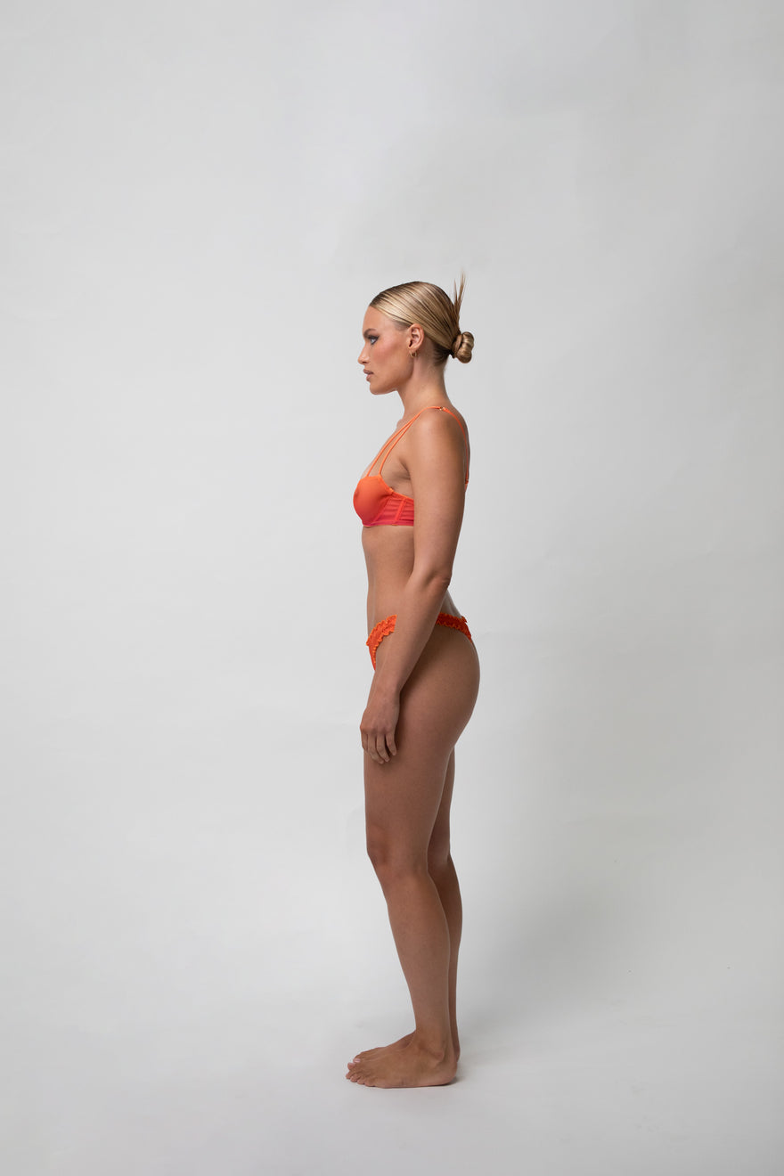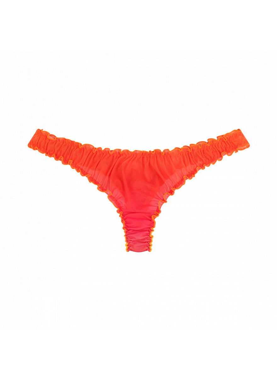 Mid-rise briefs in red gradient, stretchy, and sustainable material, with orange stitching and details. With straps at the waistband.