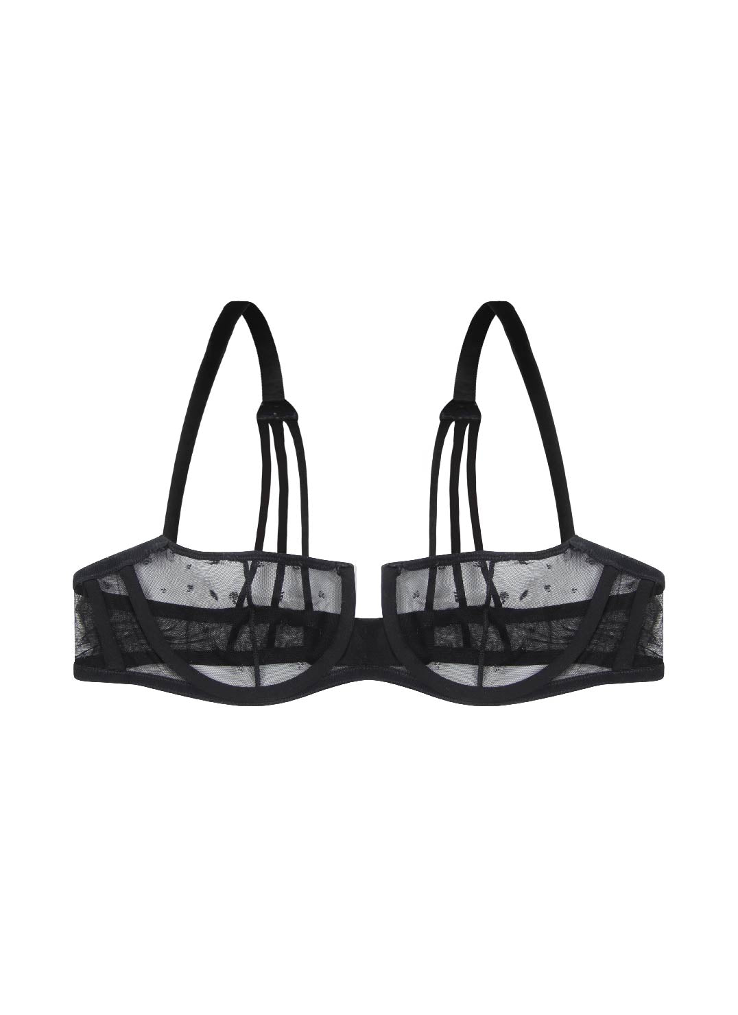 Underwire bra in black stretch material, with small, embroidered heart pattern with 3D effect and glitters. Closure at the back and with fully adjustable straps.