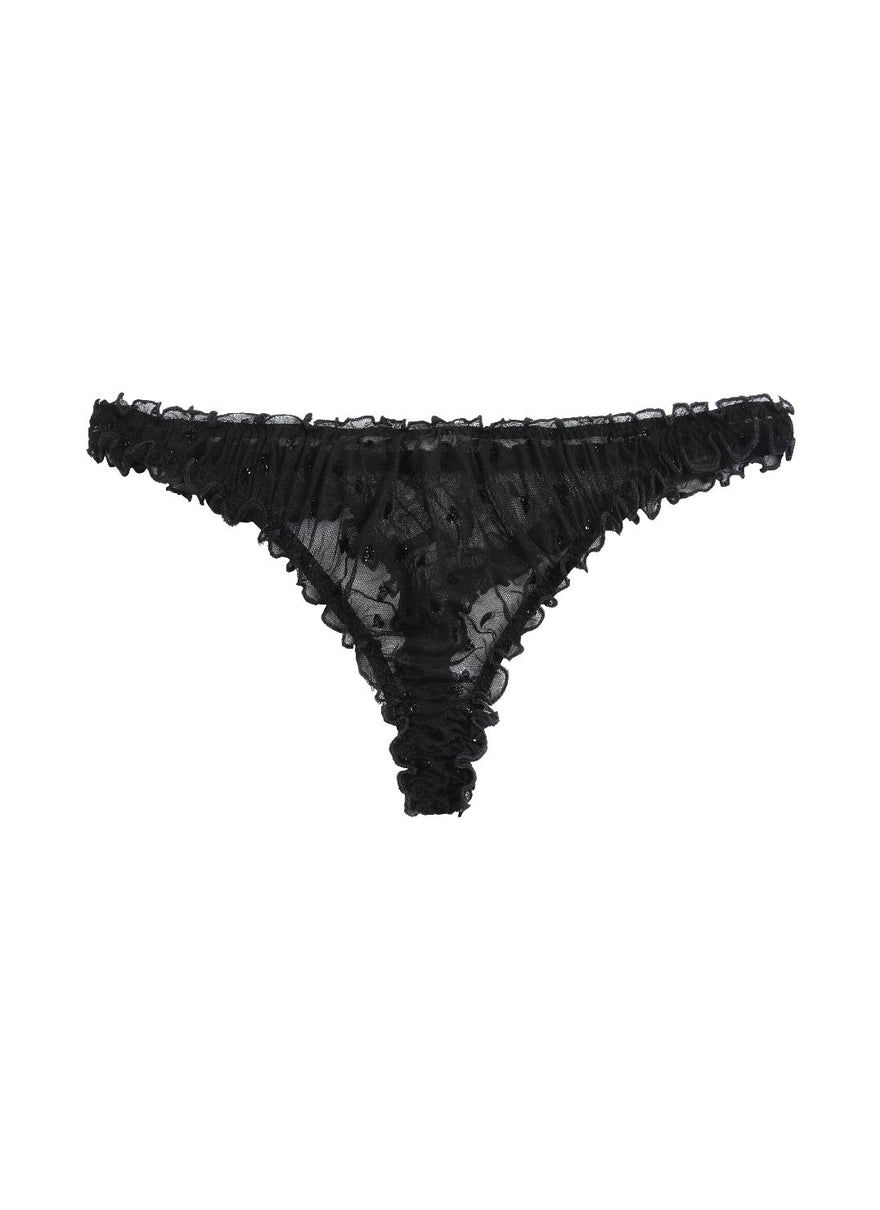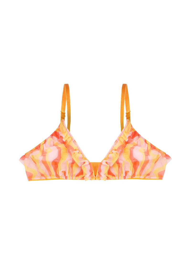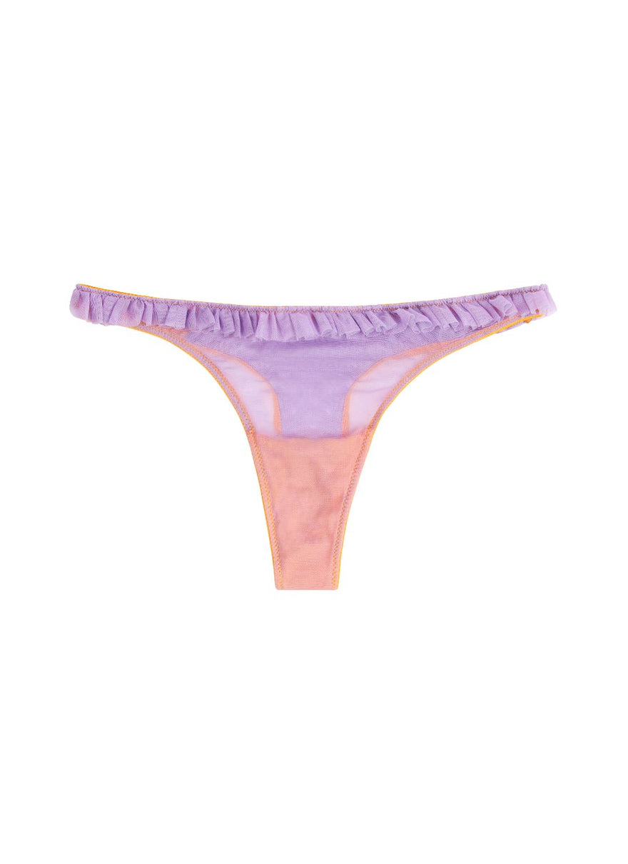 Mid-rise briefs with holographic print, stretchy and sustainable material, orange stitching and tight ruffling at the edges.