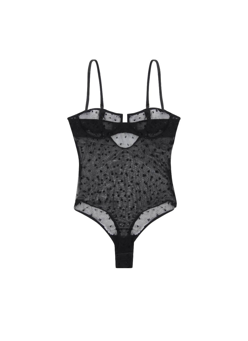 Mid-rise briefs in black, stretchy and sustainable material, with small, embroidered heart pattern with 3D effect and glitters. With ruffles at the waistband.