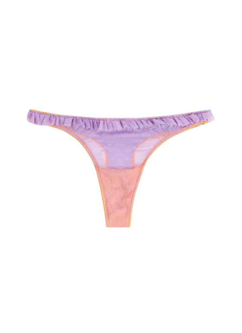 Underwire bra in purple recycled material, with orange stitching and details. Closure at the back and with fully adjustable shoulder straps.
